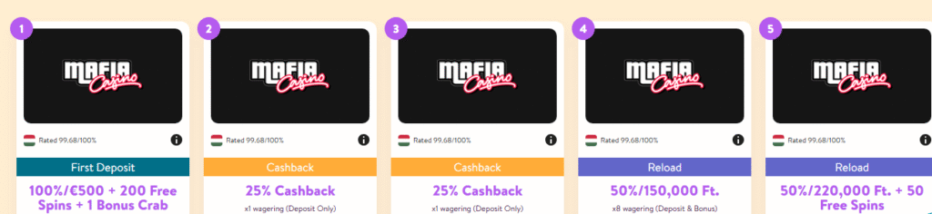 The minimum deposit of Mafia Casino is 10 EUR, 10 CAD, 20 AUD, 30 NZD.